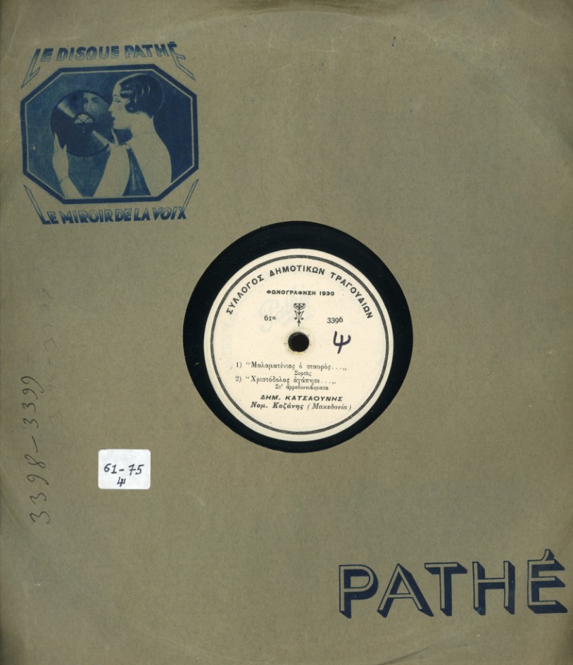Δίσκος 78 rpm (Μερλιέ 061/από τη συλλογή του ΜΛΑ) |  Από αριστερά: Γεώργιος Αγγέλου & οι εύζωνοι: Κατσανιώτης Σπύρος, Ζάχος ή Σταυροθόδωρος & Δημήτρης Κατσαούνης (Ηχογράφηση 1930) |  Από αριστερά: Γεώργιος Αγγέλου & οι εύζωνοι: Κατσανιώτης Σπύρος, Ζάχος ή Σταυροθόδωρος & Δημήτρης Κατσαούνης (Ηχογράφηση 1930) |