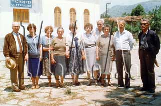 Από αριστερά: Άγνωστος, Ερμιόνη Μίχου, Χρυσούλα & Ελευθερία Καραγκούνη, Υβόνη Χαντ, άγνωστη, Μάρκος Δραγούμης, Κλεοπάτρα Τζήκα & Μηνάς Τζήκας (Κωσταράζι Καστοριάς 13/6/1991, φωτ. Βασ. Ριμπόπουλος)
