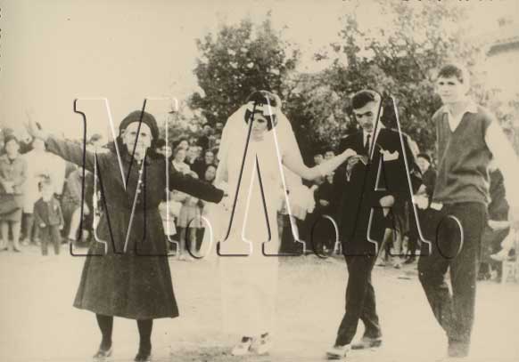 Από αριστερά: Η Πολυξένη Μανώλη σέρνει τον χορό του γάμου, η νύφη της, ο γιος της, άγνωστος